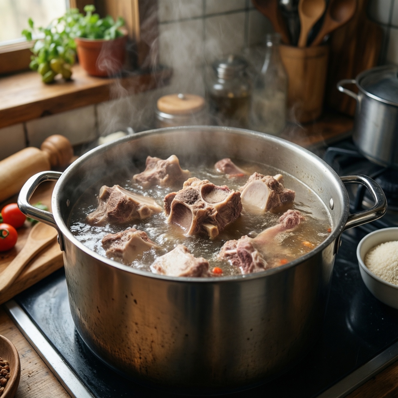 - Заливка холодной водой и старт. Сложите кости в кастрюлю и залейте холодной водой так, чтобы покрывала на 3-5 см. Медленно доведите до первых пузырьков: резкий нагрев чаще дает мутность.
