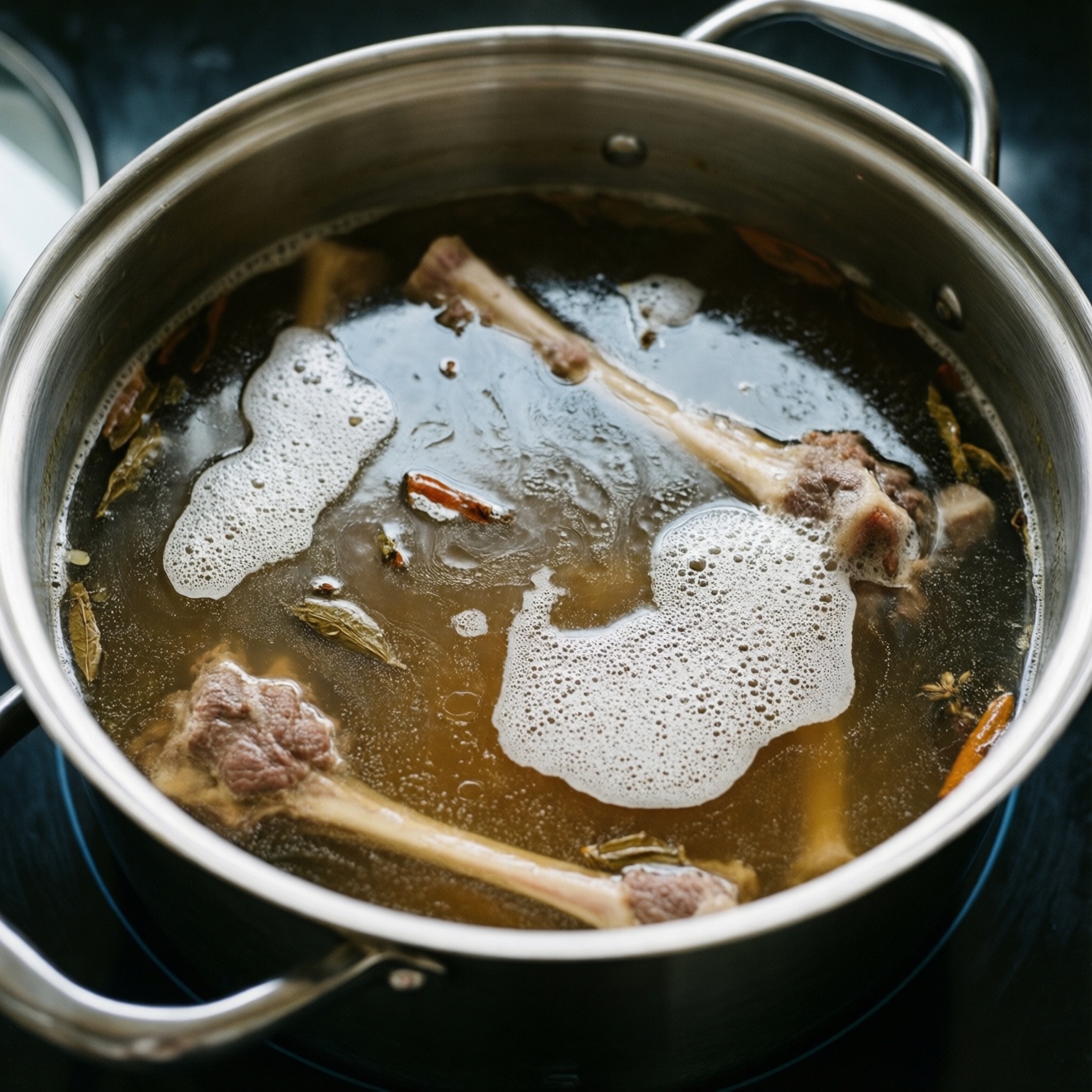 • Пропорция по воде: заливайте кости холодной водой так, чтобы она покрывала их на 3-5 см. Если воды слишком много - получится "пусто", слишком мало - легко выкипает и мутнеет.