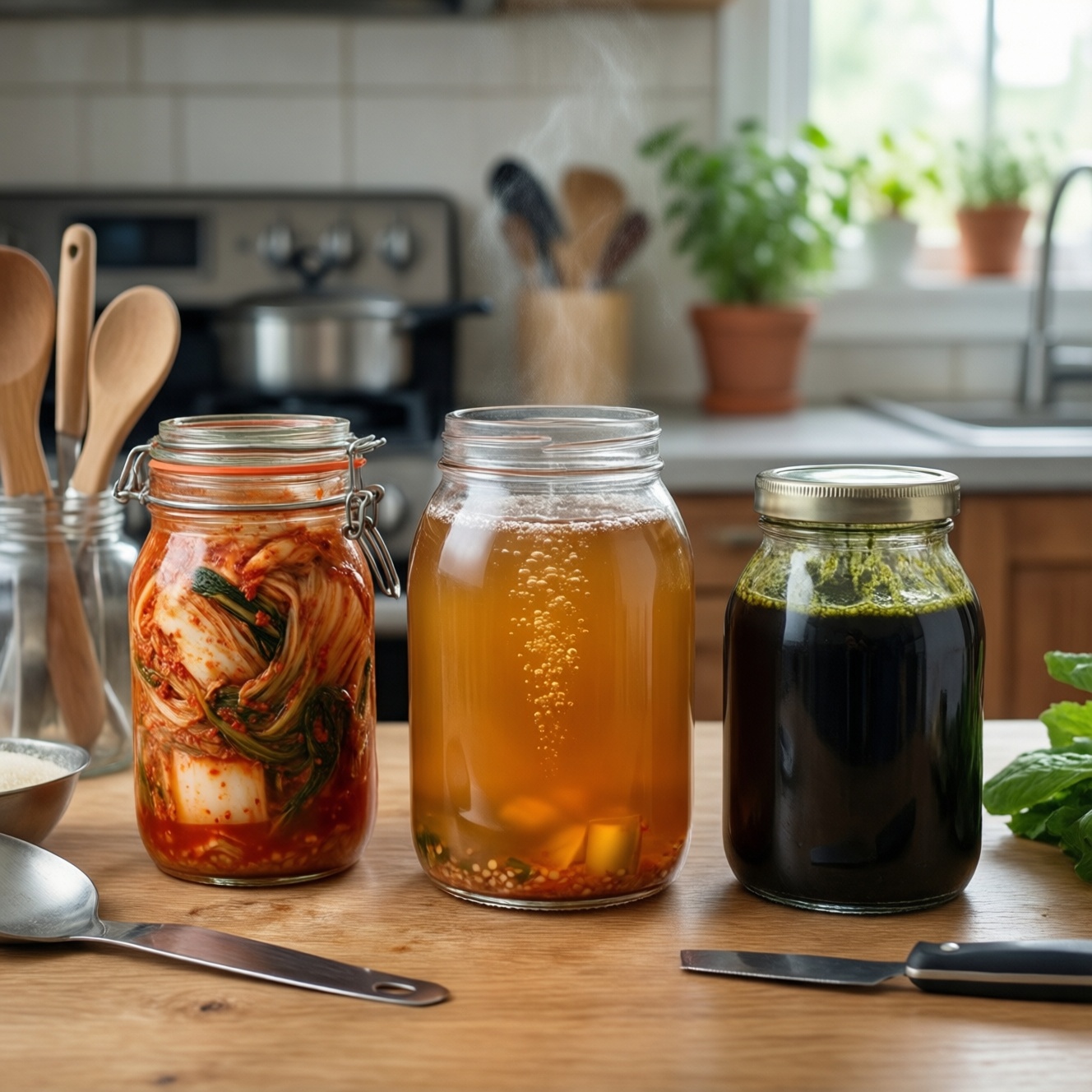 - Кулинарные применения: кимчи - в супы/жарку/соусы; комбуча - как напиток и основа для безалкогольных коктейлей; мисо - в бульоны, заправки, маринады.