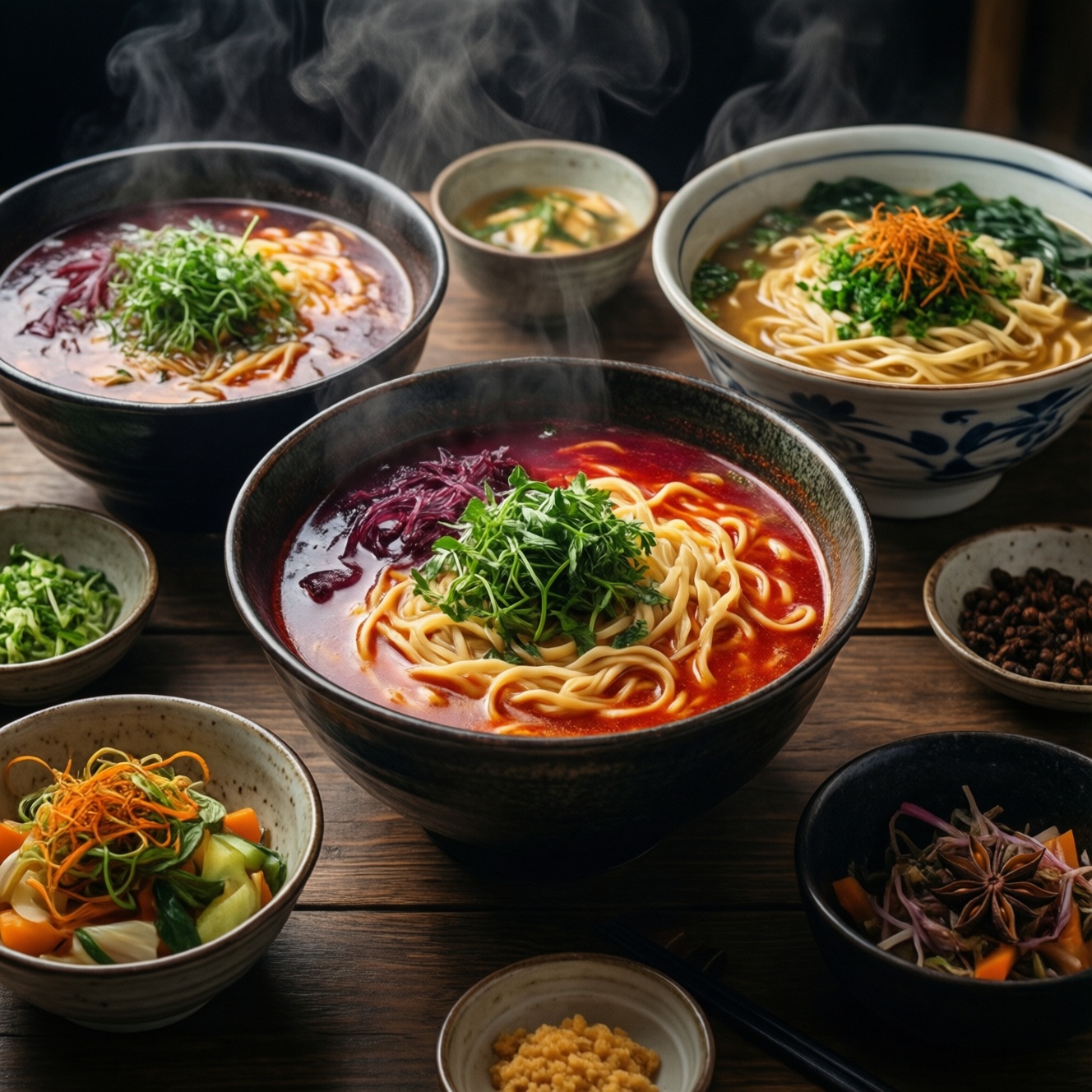 | Источник умами | Тарэ (соевое/мисо/соль), кость/птица, иногда рыба | Мясной/костный бульон, поджарка, овощная сладость | Долгое томление костей, специи, рыбный соус | Паста чили, рыбный соус, креветки/курица, иногда кокос |